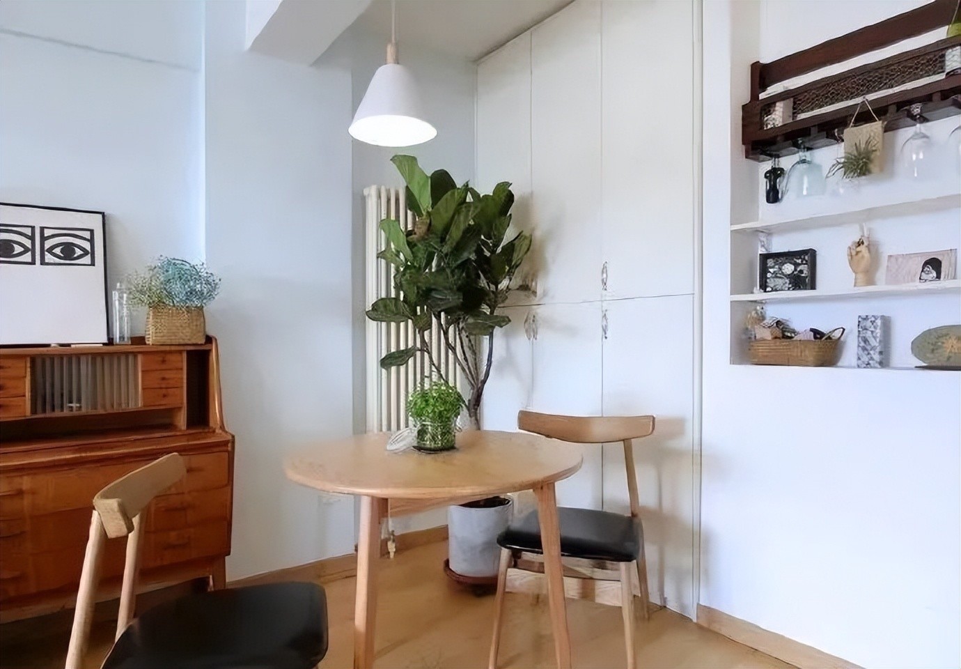 挨着沙发的墙角上放了一个原几和一把椅子,墙面上是 打 的柜子,还设有隔层,上面摆了工艺品和花草。平时不喜欢窝在沙发里,就可以坐在这个茶几上。