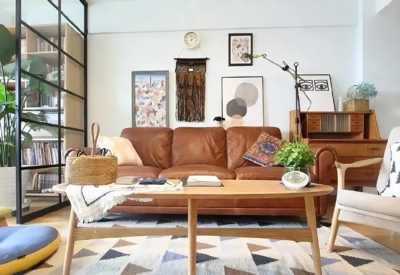 从正面看沙发是一个皮质的三人座沙发,砖红色的沙发搭配白墙看起来格外耀眼。墙面上挂着许多装饰画,沙发旁边是一个柜子,能收纳许多生活用品。