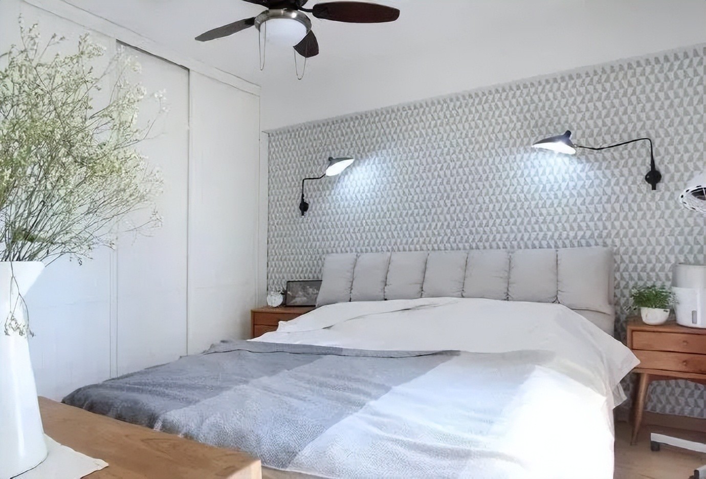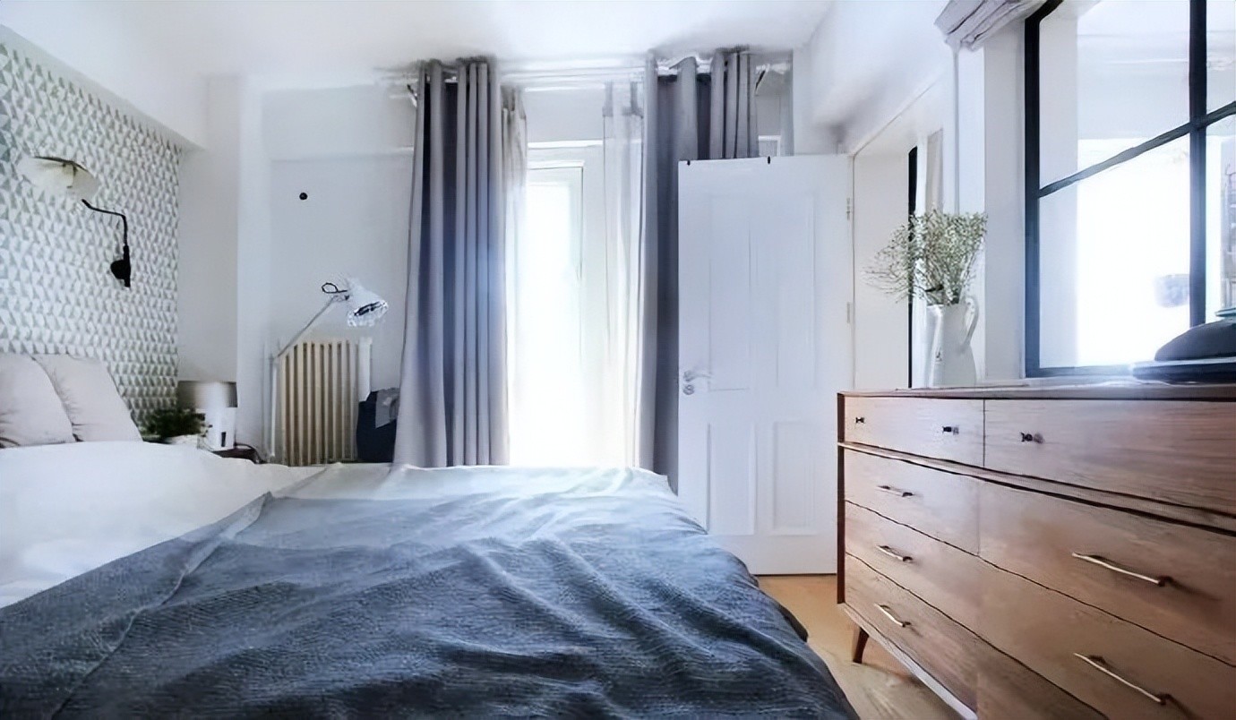 卧室装修的是素雅风格,床头背景贴的素色几何图案的壁纸,搭配米白色的沙发。旁边是一个推拉门式的大衣柜,白色的百搭。床尾放的是原木色的斗柜,用来收纳内衣。
