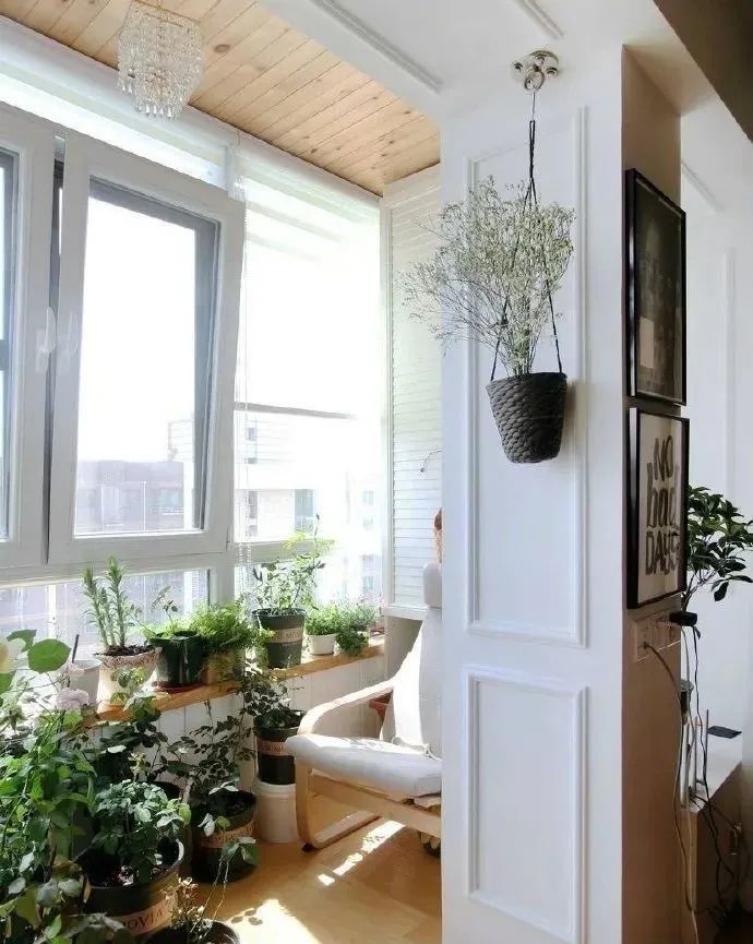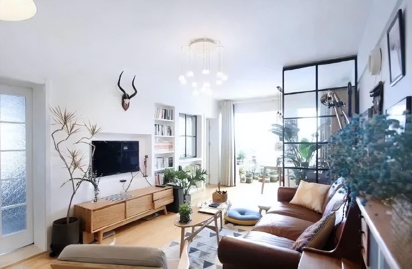 客厅的户型是长方形的,用玻璃隔断分成了两部分,挨着窗户的部分变成了阳台花房,里面养着许多绿色植物,它们尽情地吮吸着阳光 给于 的养分。